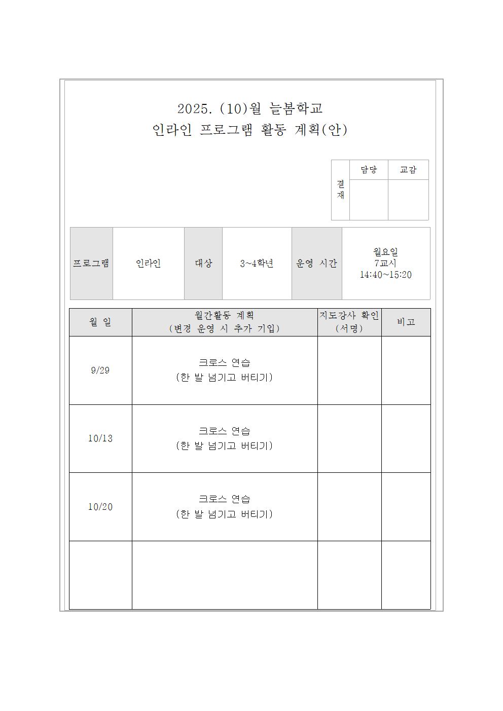 10월 인라인교실 활동 계획(안)