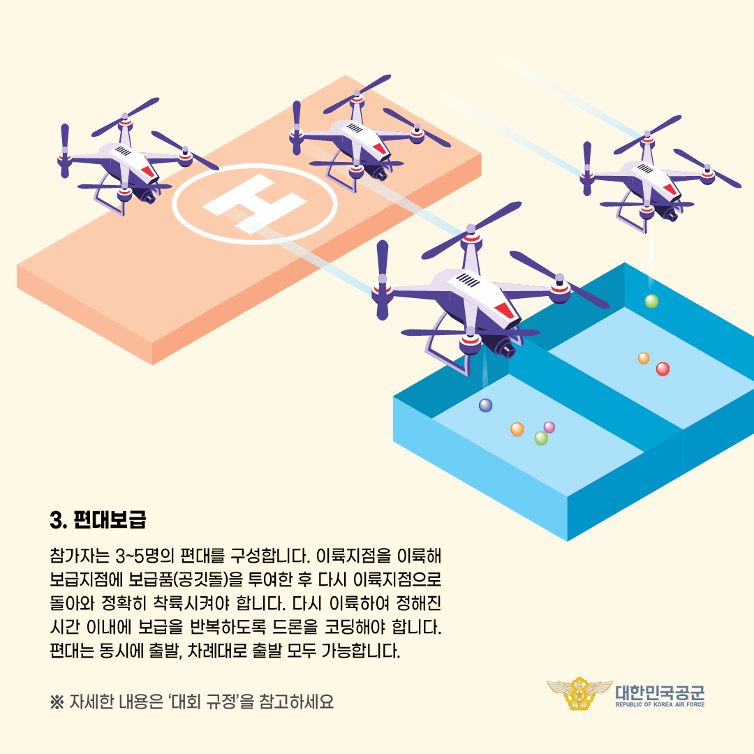 3) 편대비행 : 드론을 통해 지정된 양의 보급픔(공깃돌)을 최대한 많이 보급지점의 박스에 옮김