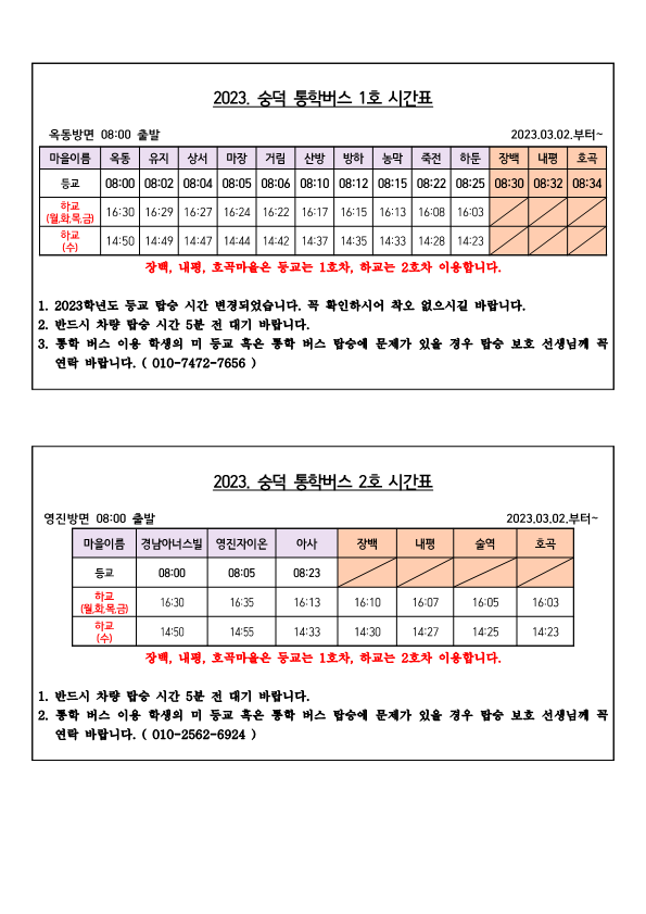 1. 2023학년도 등교 탑승 시간입니다. 꼭 확인하시어 착오 없으시길 바랍니다.