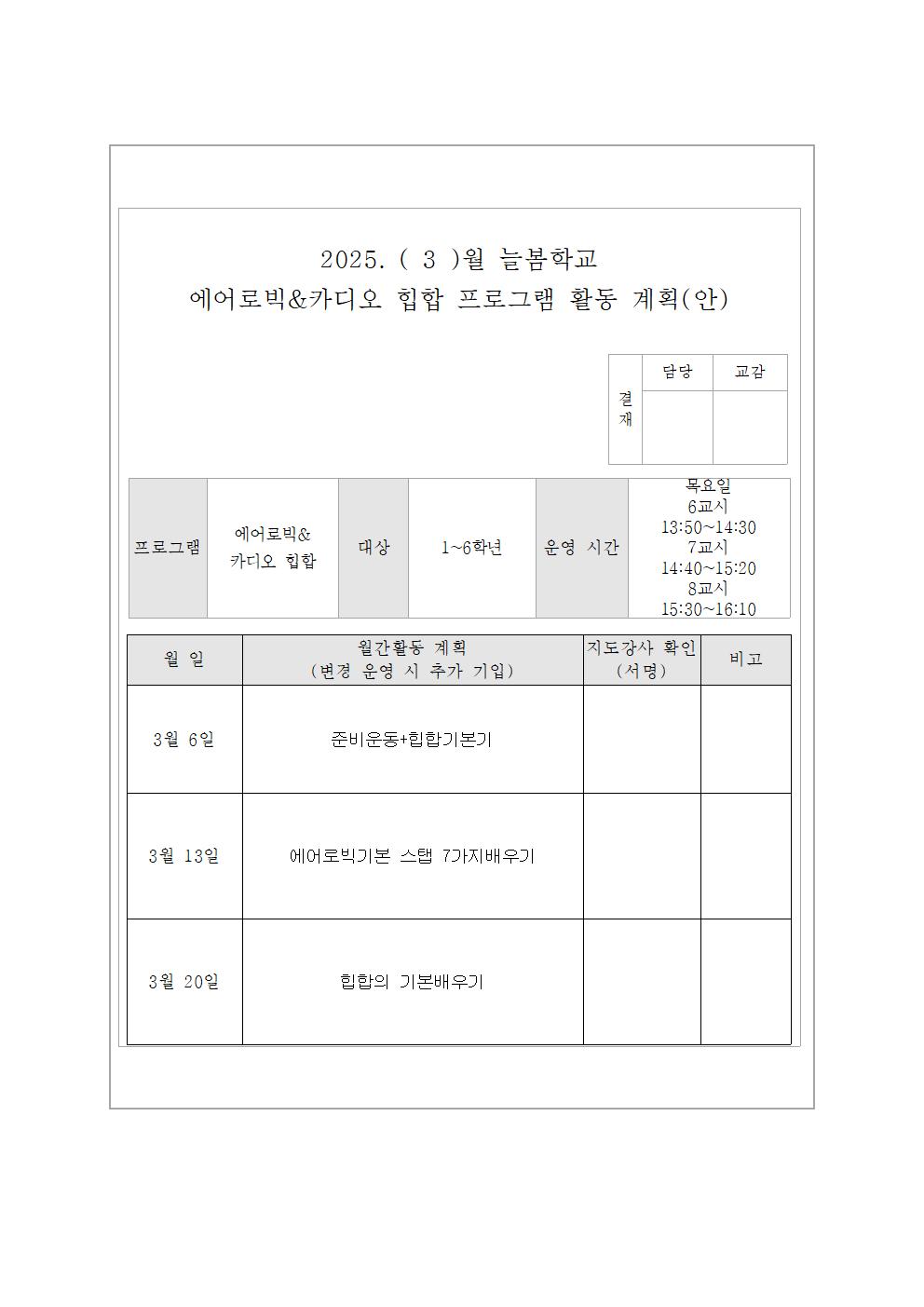 2025. 3월 에어로빅 & 카디오 힙합 활동 계획(안)