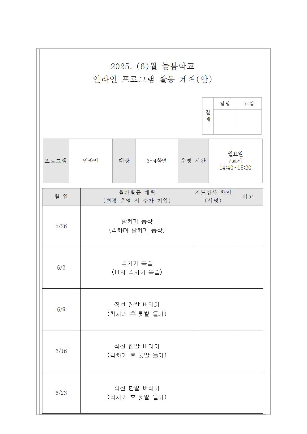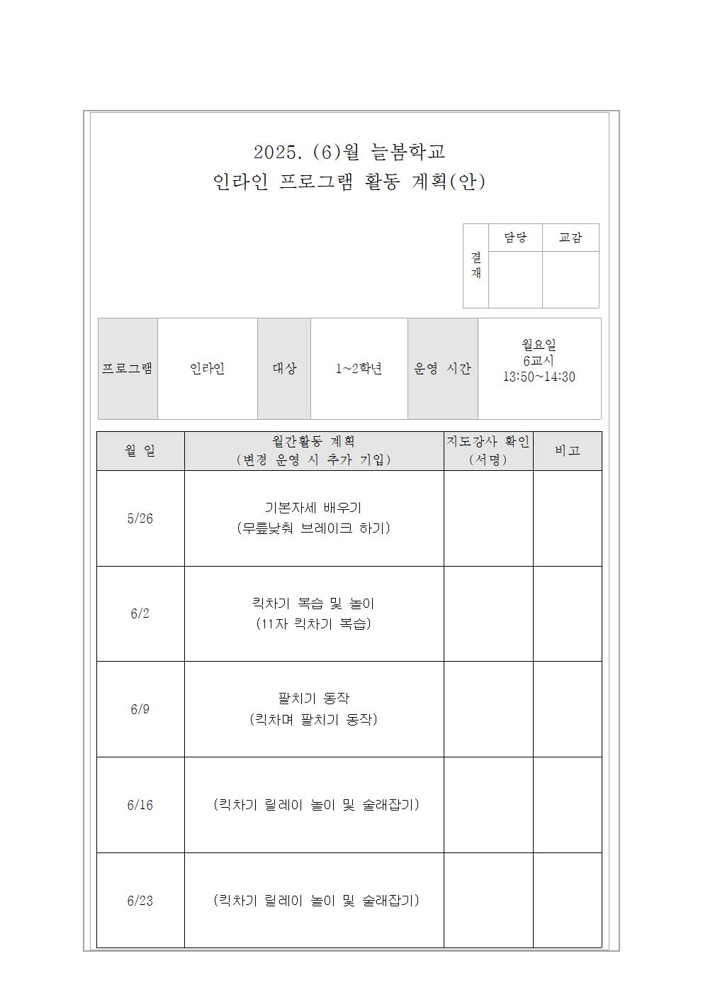 6월 인라인교실 활동 계획(안)