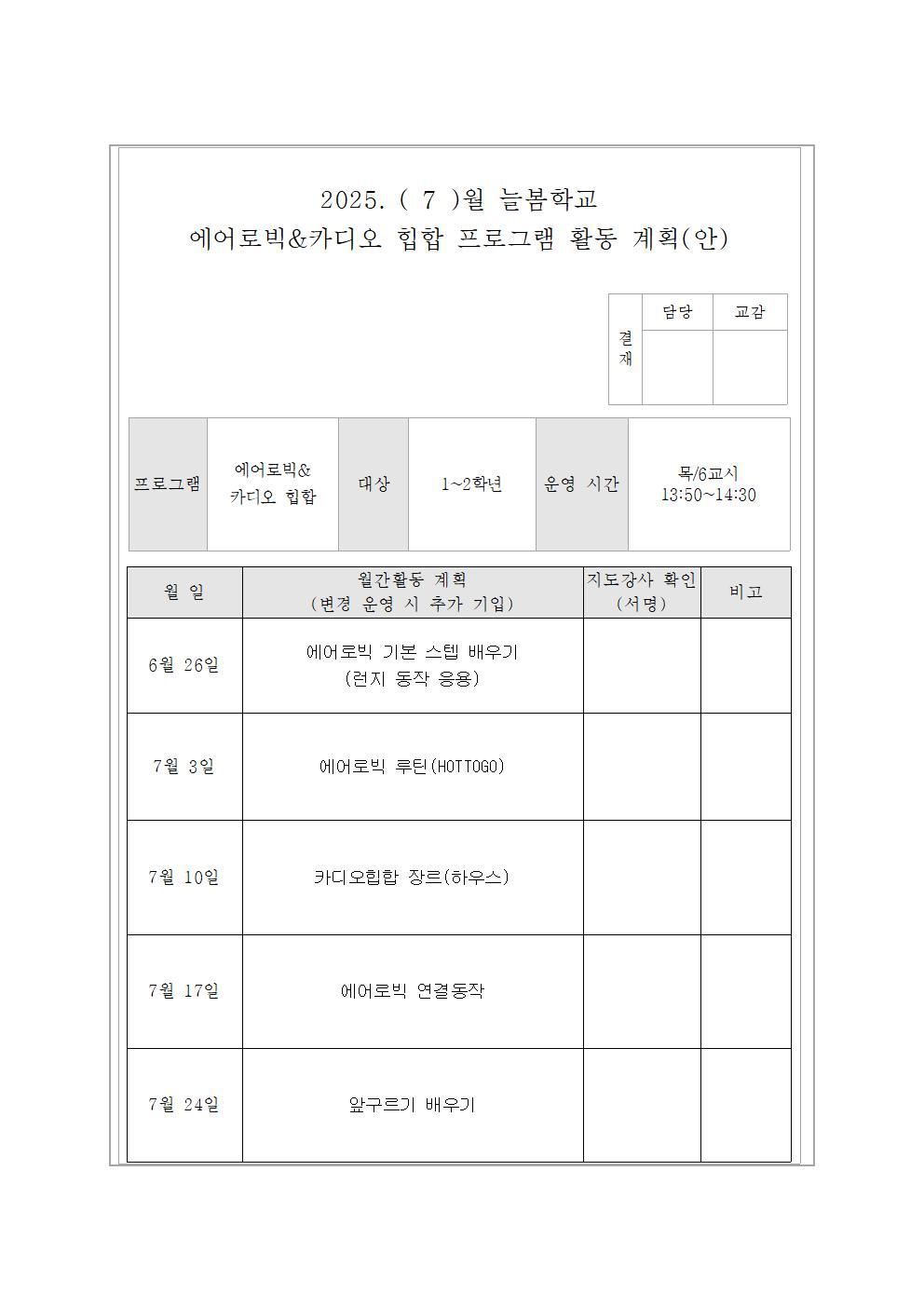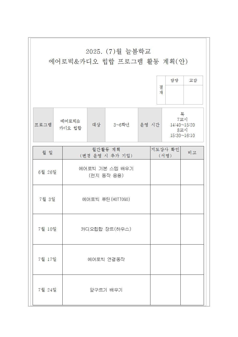 7월 에어로빅&카디오힙합교실 월간 계획(안)