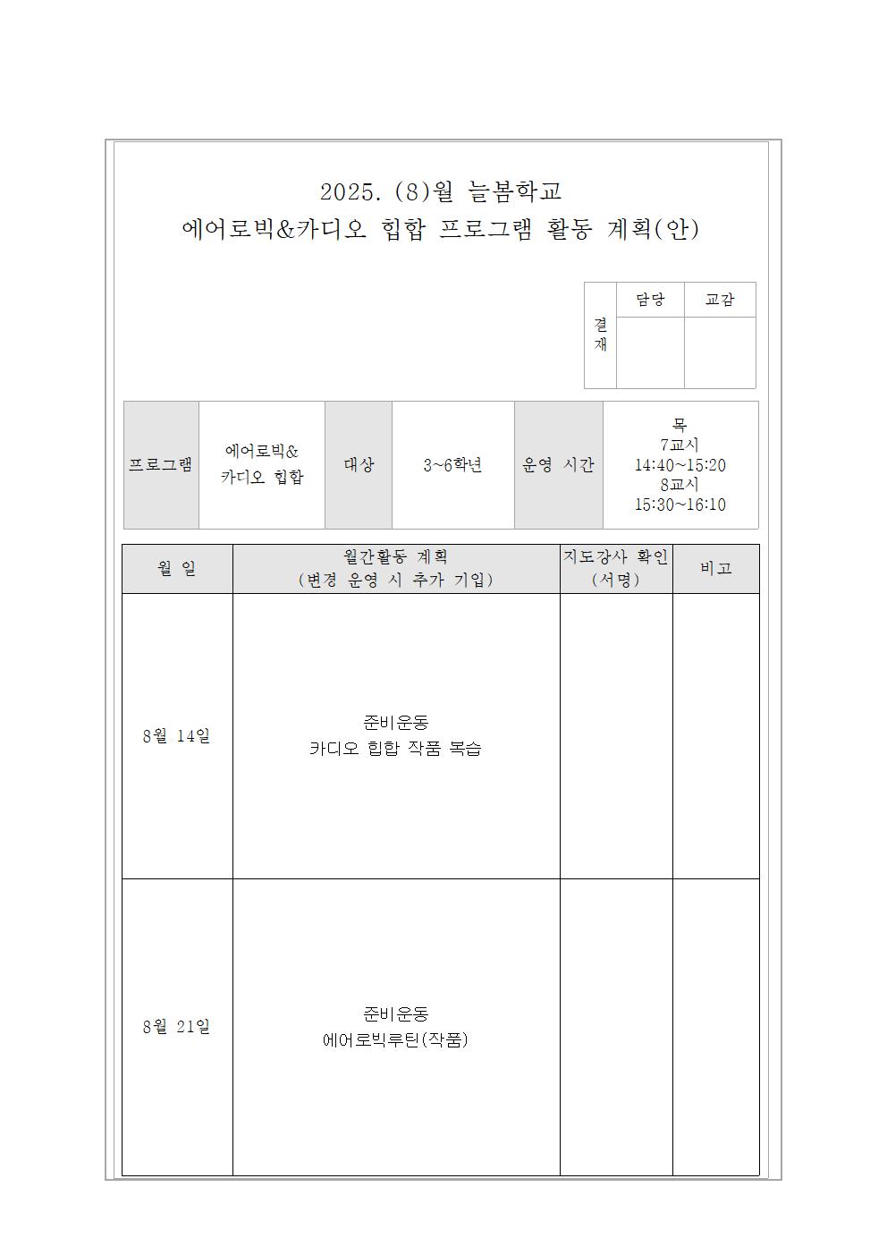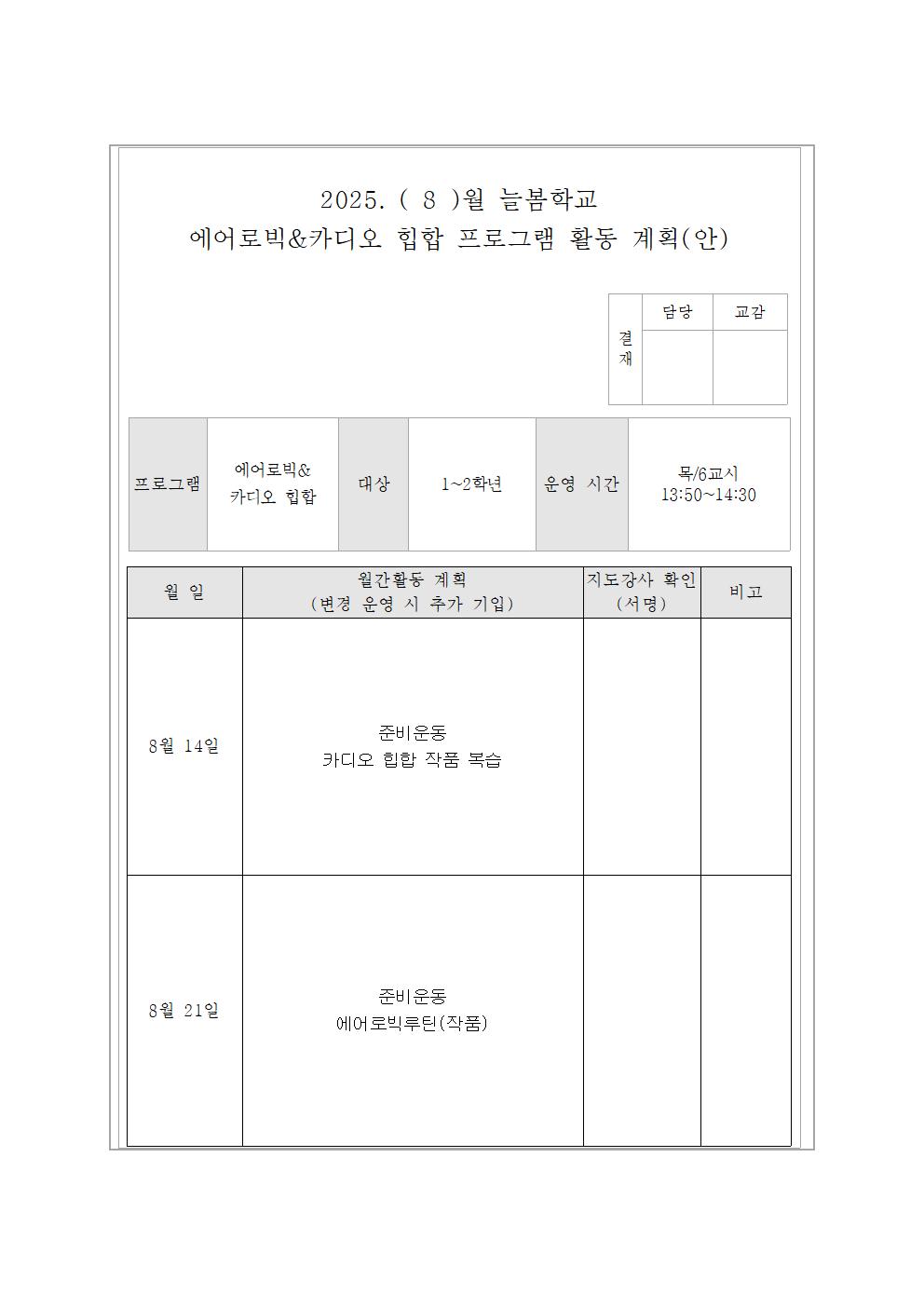 8월 에어로빅 활동 계획(안)